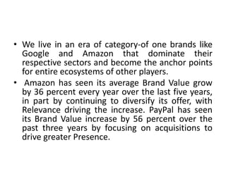 Amazon has seen the fastest brand value growth of 56% due to its focus on positive utility and being the most customer-centric company. It has reinvented sectors like e-commerce, smart speakers, streaming music, and TV shows. Subscription-based brands now make up 29% of the top 100 brands' total value due to their ability to offer personalized services. Luxury brands grew 42% by delivering premium experiences and personalized service. Leading brands are co-creating solutions with customers and investing in anticipating emerging needs.