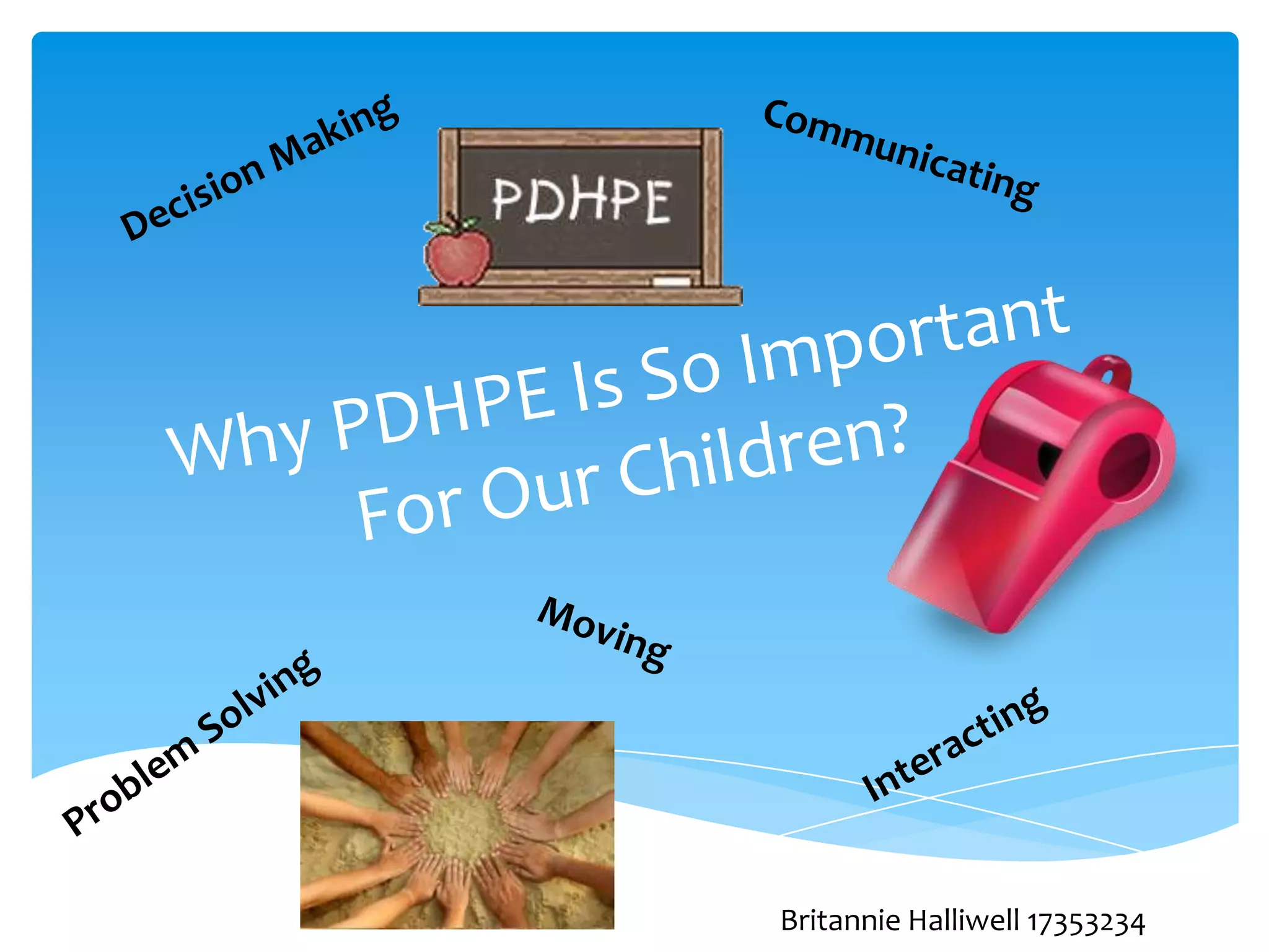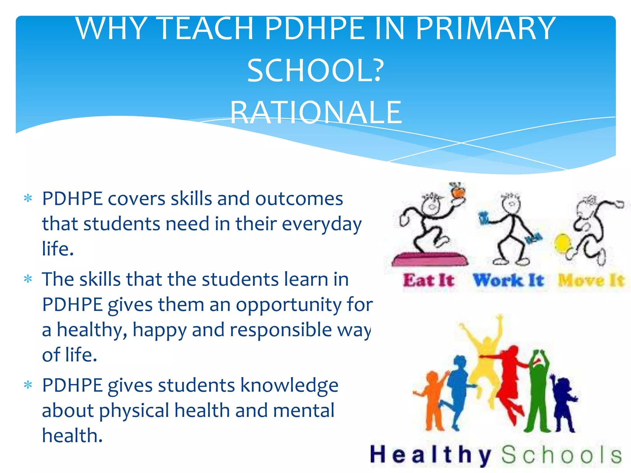 PDHPE teaches primary school students skills needed for everyday life, allowing them to lead healthy, happy lives. It provides knowledge of physical and mental health. PDHPE covers personal development, health, and physical education, educating students about themselves, interpersonal relationships, personal health choices, and physical activity. The main reason it should be taught is because it is fun for students.