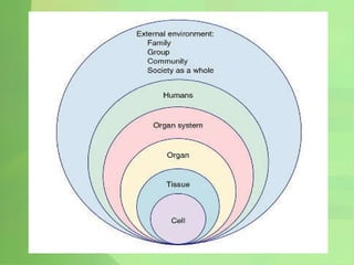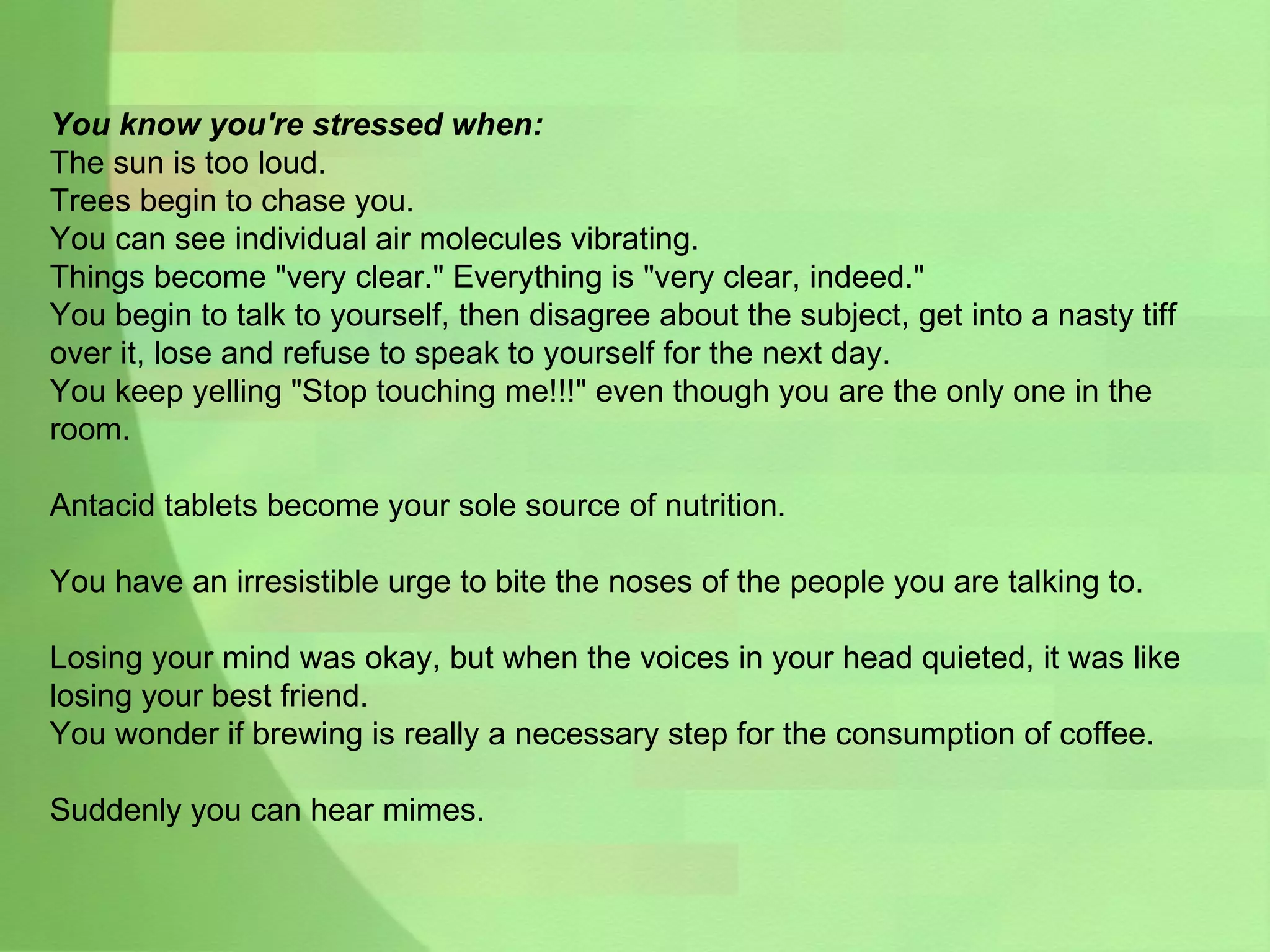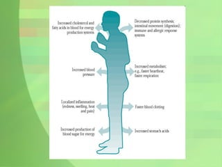 The document describes signs of stress including hearing voices and air molecules, talking to oneself, and craving unusual foods. It then discusses homeostasis and the body's response to stress, including physiological changes and potential health impacts of prolonged stress. Finally, it provides tips for managing stress through diet, exercise, relaxation, and maintaining a positive attitude.
