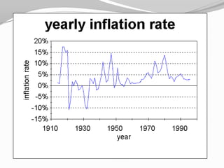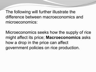 This document discusses the differences between microeconomics and macroeconomics. Microeconomics examines specific markets and how individual supply and demand affects prices. Macroeconomics looks at overall economic trends and how monetary policy impacts the whole economy. The document then provides details on inflation, including causes like demand-pull and cost-push inflation. Effects of inflation include reduced purchasing power and discouragement of savings. Ways to combat inflation include fiscal and monetary policies at the national level and conservative spending at the individual level. The document also briefly discusses deflation.