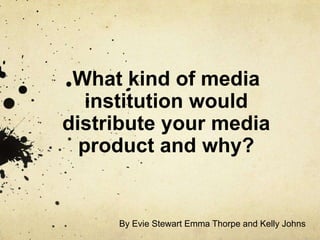 Warp Films would be the best media institution to distribute the media product discussed in the document. Warp Films is an independent UK-based film production and distribution company that has experience successfully producing and distributing independent films. While major studios like 20th Century Fox and Warner Bros focus on larger budget films, Warp Films and related companies like Studio Canal specialize in independent films and have networks for distribution in the UK and sometimes internationally. For these reasons, Warp Films would be most likely to distribute an independent British film like the one discussed.