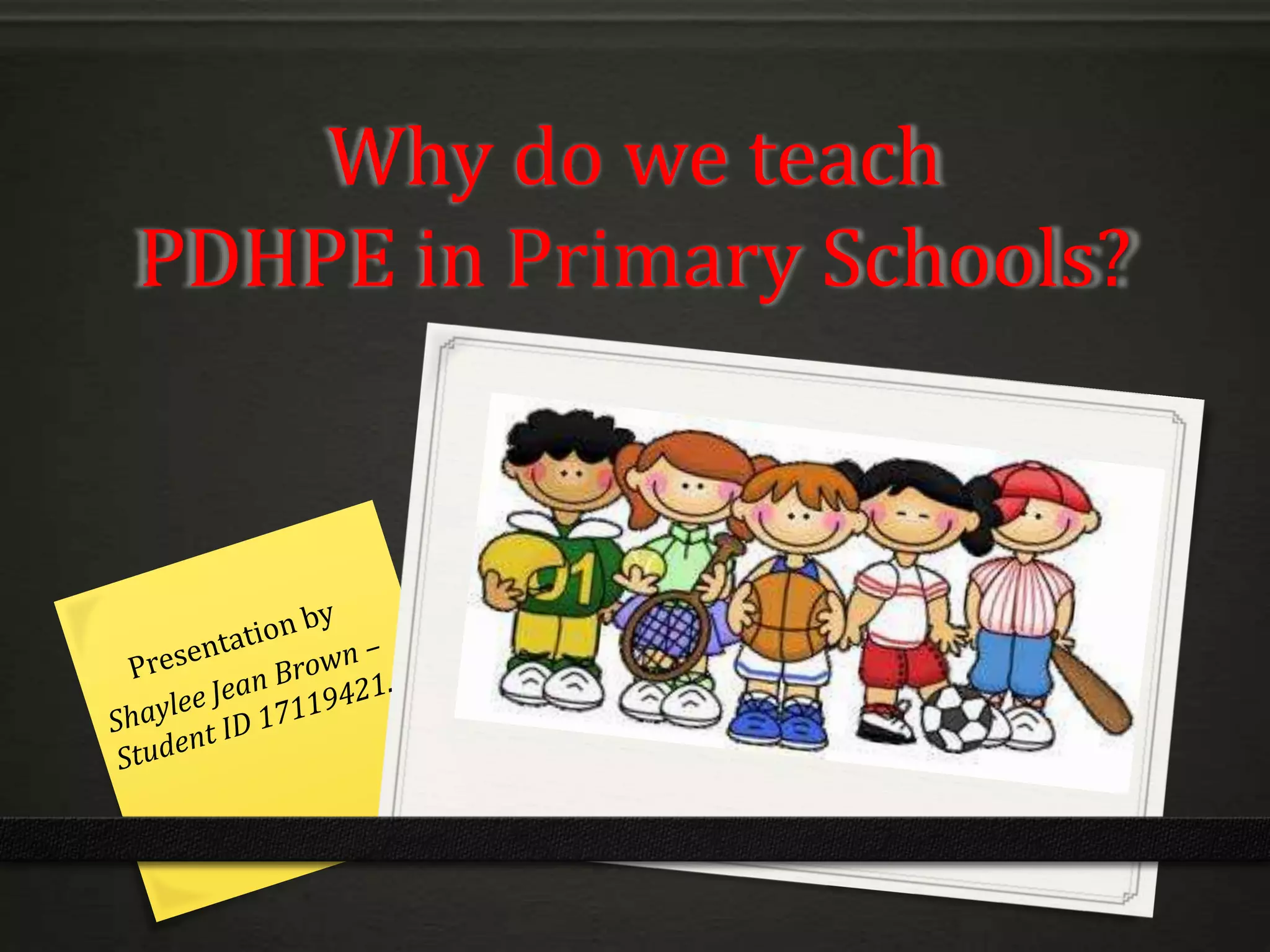 PDHPE in primary schools aims to promote physical activity, develop social relationships, encourage healthy lifestyle choices, and promote safety. It does this by encouraging regular physical activity to improve health, using team sports to teach cooperation and social skills, educating students on nutrition and healthy eating, and teaching students to recognize and handle dangerous situations.