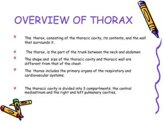 The thorax contains the organs of the respiratory and cardiovascular systems. It is bounded by the sternum, vertebrae, and ribs. Within the thoracic cavity are two pleural cavities housing the lungs and a central mediastinum containing the heart, great vessels, trachea and esophagus. The lungs, pleura, chest wall and mediastinal structures were described in detail.