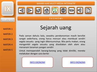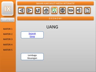 Dokumen ini membahas berbagai aspek mengenai uang, termasuk pengertian, jenis, dan fungsi uang dalam perekonomian, serta pengaruh kebijakan pemerintah terhadap jumlah uang yang beredar. Juga dijelaskan tentang nilai uang seperti nilai intrinsik, nominal, dan riil, serta faktor-faktor yang memengaruhi inflasi dan deflasi. Selain itu, terdapat informasi historis mengenai sistem uang dan tokoh ekonomi yang berpengaruh dalam bidang ini.