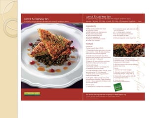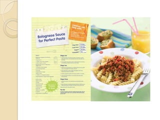 This document analyzes the layout, design, and target audiences of various recipe cards and books. It finds that most have a consistent layout with the finished product photo on one side and the recipe on the other, along with minimalist design elements like a consistent color scheme. However, some cards designed for specific audiences or occasions diverge from this basic template by using more creative graphics, fonts, or colors. The document concludes that while keeping a simple, clear layout is best for recipe instructions, some customization may be needed to effectively target different age groups or seasonal themes.