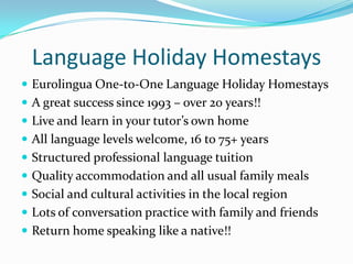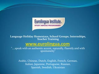 Eurolingua offers immersive language holiday homestays for students aged 16 to 75+ in various languages, allowing learners to live with tutors and practice conversational skills. The program includes structured tuition, quality accommodation, and cultural activities across several countries, including France, Spain, Italy, and more. Furthermore, they provide additional language courses and internships through their institute for those seeking professional development.