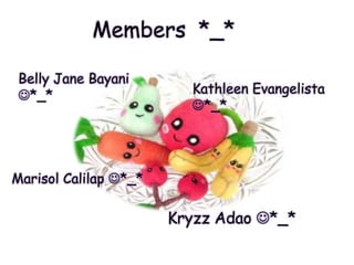 This document lists 4 members of Group-VI: Belly Jane Bayani, Kathleen Evangelista, Marisol Calilap, and Kryzz Adao. Smileys are included by each member's name.