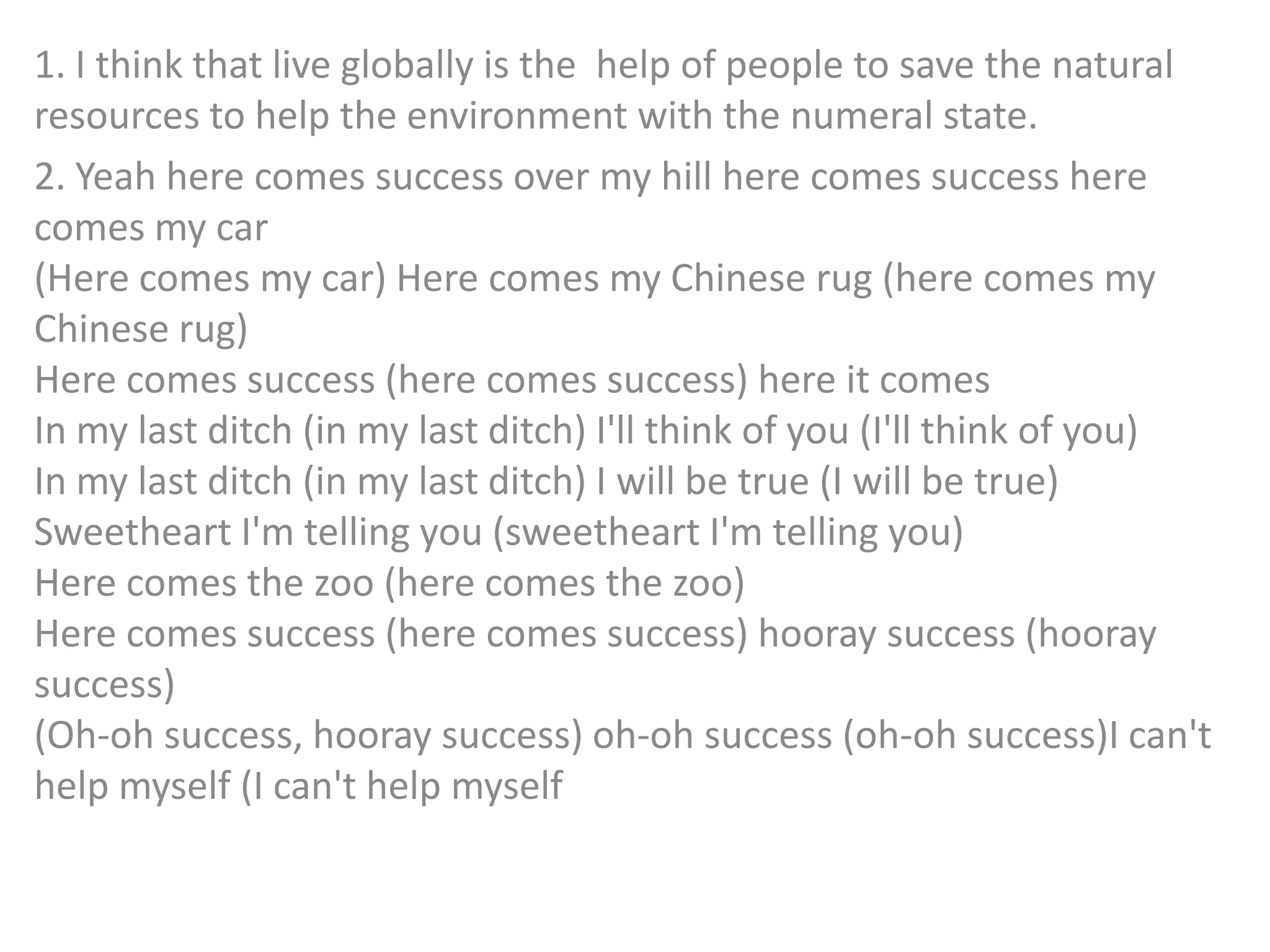 The document discusses living globally and helping the environment through saving natural resources with national cooperation. It also references lyrics about success and material possessions coming, but ending with the truth depending on time in nature. Several quotes are provided about nature, art, and truth.