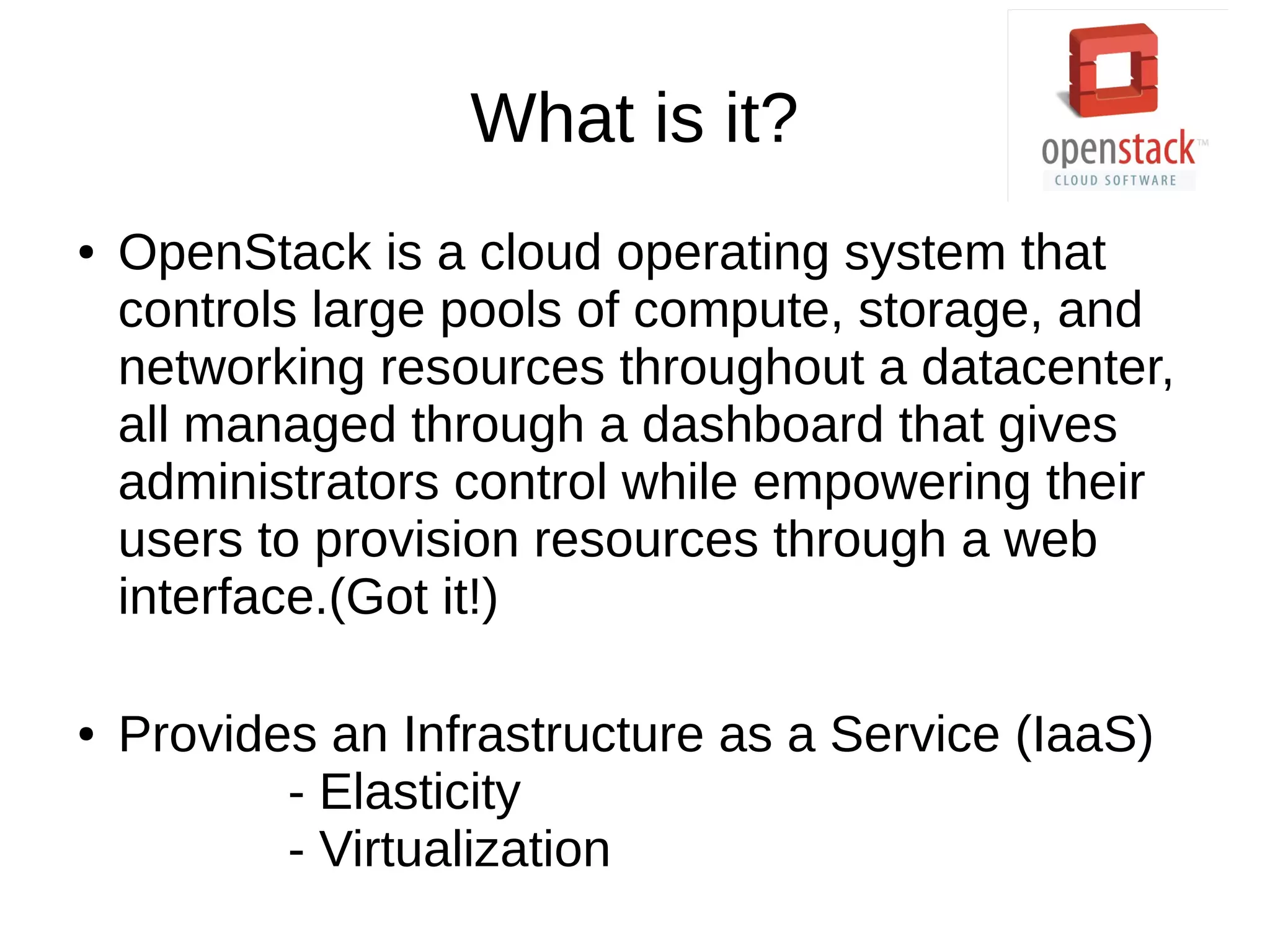 What is it? ●OpenStack is a cloud operating system that controls large pools of compute, storage, and networking resources throughout a datacenter, all managed through a dashboard that gives administrators control while empowering their users to provision resources through a web interface.(Got it!) ● Provides an Infrastructure as a Service (IaaS) - Elasticity - Virtualization