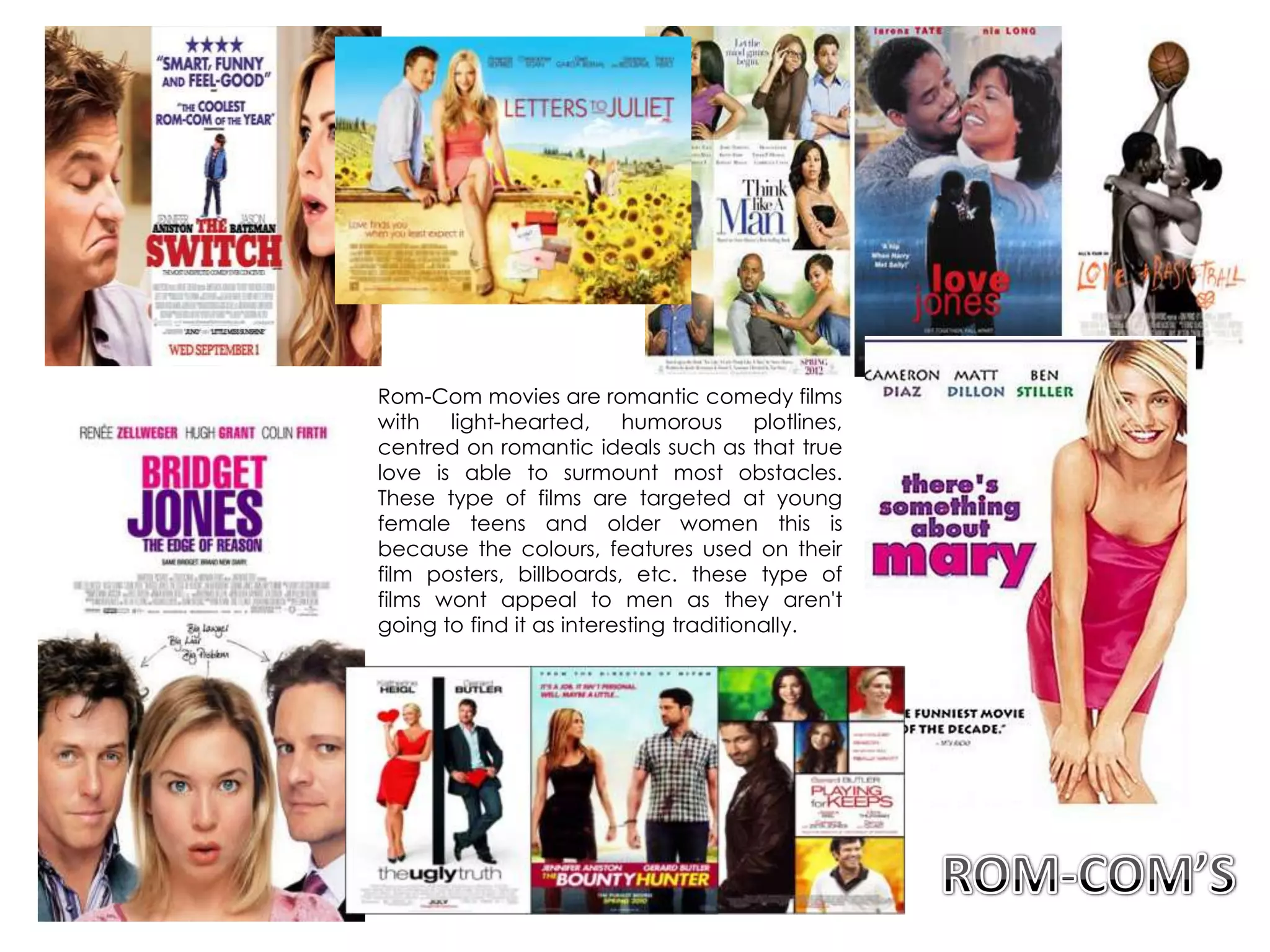 Rom-com movies target young female audiences through their lighthearted plots focusing on love overcoming obstacles, as well as colorful posters and imagery. These films do not generally appeal to male audiences, who may not find the stories as interesting. The document then analyzes several movie posters, noting how elements like characters, colors, and background settings are used to convey a sense of the genre and target particular demographic groups.