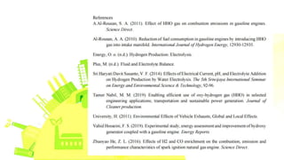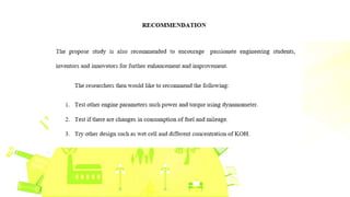 This document outlines a study on evaluating the potential of oxyhydrogen (HHO) gas to enhance gasoline engine performance. It discusses: