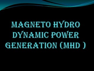 This document summarizes a seminar presentation on magneto-hydrodynamic (MHD) power generation. MHD power generation uses electrically conducting fluids like plasmas or liquid metals flowing through magnetic fields to generate electricity. It was developed as a more efficient alternative to conventional power plants. The presentation covers the principles of MHD generation, which involve inducing voltage and current via Faraday's law of induction when a conductor moves through a magnetic field. It also describes open-cycle and closed-cycle MHD systems, advantages like higher efficiency and smaller size, and challenges such as high heat losses and cost of large magnets. The conclusion discusses potential for MHD to play a larger role in future power generation as the technology advances.