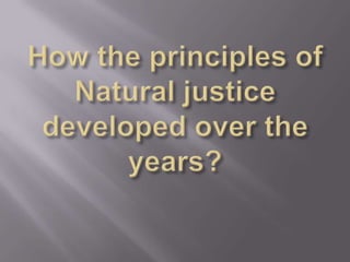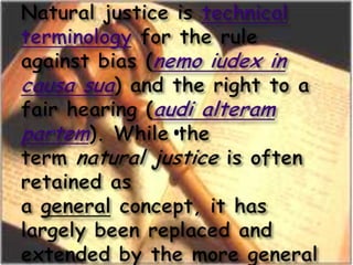 This document discusses the principles of natural justice and a fair legal process. It outlines two main principles: 1) Both sides must be heard, also called audi alteram partem, and 2) No man shall be a judge in his own cause. It also discusses the requirements for a fair legal process, including giving notice, allowing each side to present evidence and cross-examine witnesses, and having an impartial judge or tribunal make the decision. The overall message is that natural justice and a fair legal process require impartiality, fairness for both sides, and following proper judicial procedures.