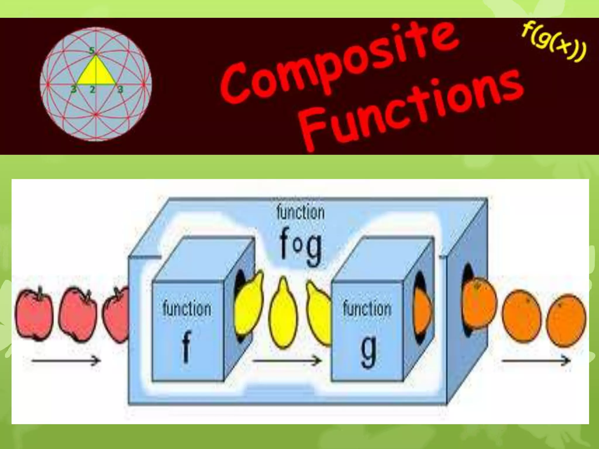 - Function composition involves applying one function to the results of another function. It is written as g(f(x)) or (g o f)(x).