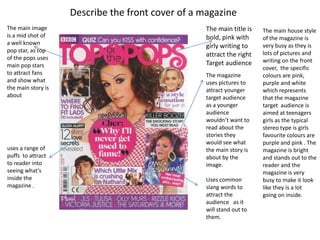 The front cover of a teenage girls' magazine uses bright pink and purple colors, many pictures, and catchy writing to attract its target audience. The main image is a mid-shot of a popular pop star to draw in fans. Throughout the magazine, clear layouts with bold fonts and highlighted sections are used to guide the reader through interesting stories and information. Photographs are featured prominently to engage younger readers who might not want to read extensive text.