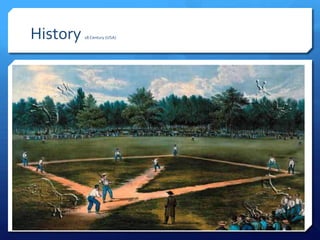 Baseball is a sport derived from British rounders that was first played in the 18th century United States and has since spread to other countries like Canada, Japan, and the United Arab Emirates. The document outlines the history and origins of baseball, the equipment and field layout, and mentions that the author enjoyed baseball and that there is now a baseball diamond in Abu Dhabi.