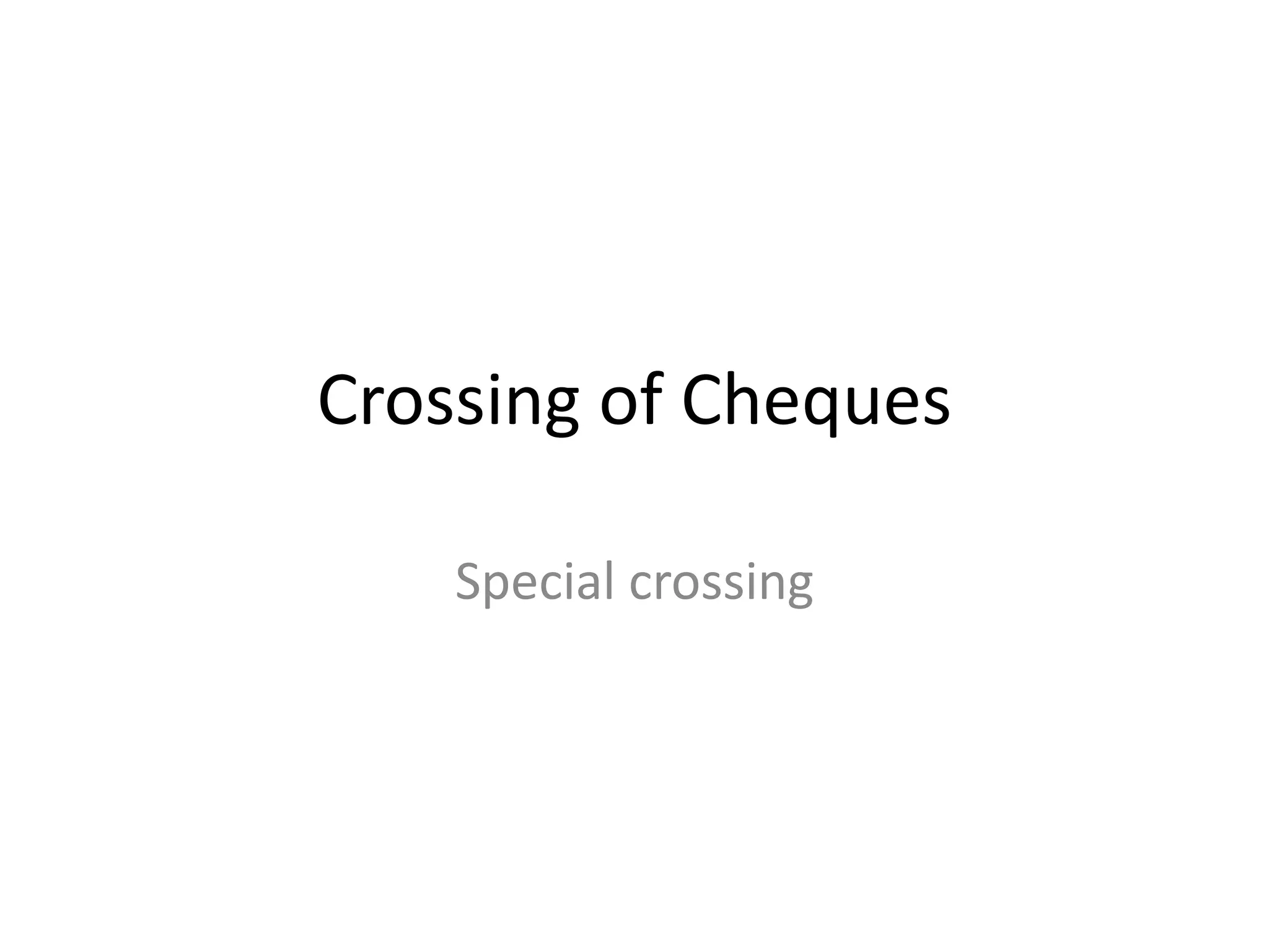 Crossing of cheques can be special or general. Special crossing involves writing the name of a specific banker on the cheque, directing the paying banker to only pay that named banker. General crossing involves drawing two parallel transverse lines on the cheque without naming a banker. A cheque can also be doubly crossed by naming two bankers, though paying bankers are only supposed to pay a doubly crossed cheque if the second banker is an agent of the first. Only the drawer of a cheque can open or cancel a crossing. Endorsement allows the negotiation and transfer of order instruments and involves signing the back or face of the instrument. There are different types of endorsements like blank, special, restrictive, partial, and conditional.