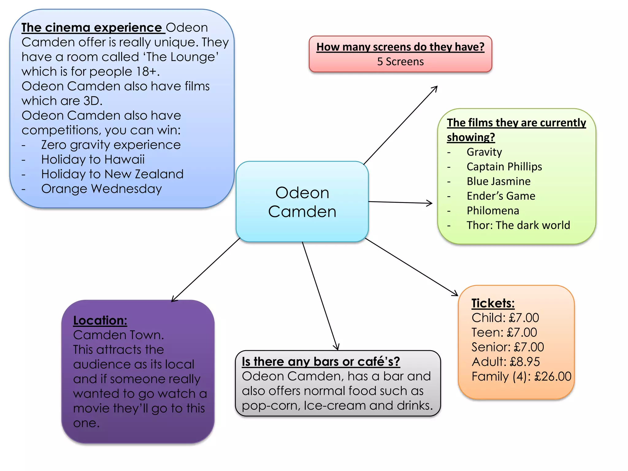 Odeon Camden, Vue Westfield, and Renoir Curzon. Odeon Camden has 5 screens, offers 3D films and competitions to win prizes. It has a bar and café and is currently showing films like Gravity. Vue Westfield has 17 screens and 3 premium luxury screens, with a large parking garage located in Westfield. Renoir Curzon has 2 screens in the Brunswick area and targets an older audience with a bar for people 18+ and film discussions after screenings.
