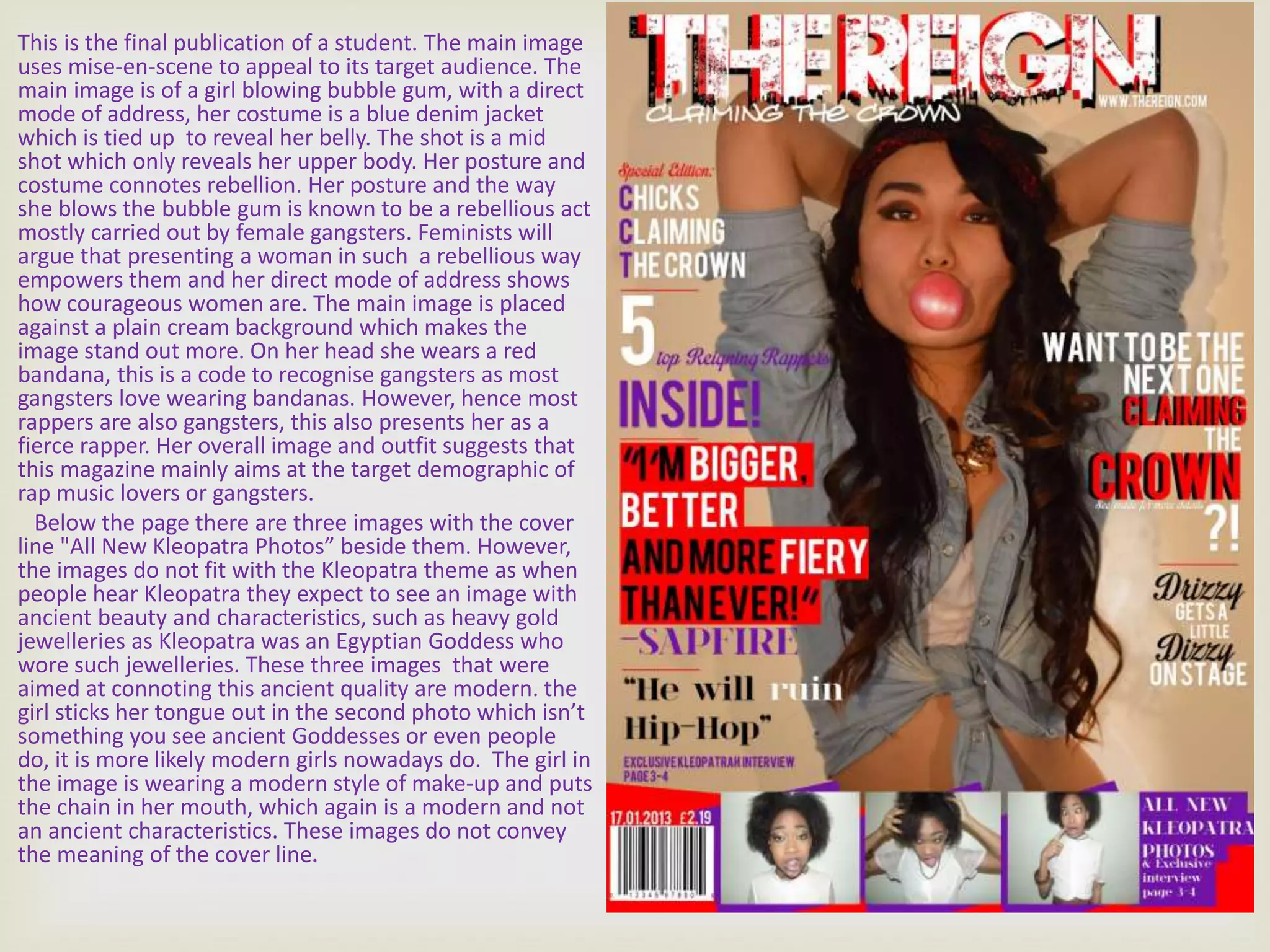 1) The main image shows a girl blowing bubble gum to appeal to rap music lovers and gangsters. Her outfit connotes rebellion. However, images of "Kleopatra" below do not fit the ancient Egyptian theme.