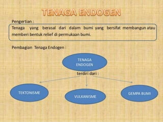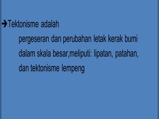 Gempa bumi tektonik disebabkan oleh aktivitas pergeseran lempeng-lempeng tektonik yang dapat menimbulkan kerusakan dan bencana. Epirogenesa dan orogenesa merupakan dua jenis pergerakan lempeng yang berbeda, dengan epirogenesa bergerak lambat dan orogenesa bergerak cepat, mempengaruhi bentuk permukaan bumi. Patahan yang terbentuk akibat tekanan horizontal dan vertikal menghasilkan struktur geologi seperti graben, horst, dan flexuur.
