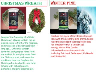 This document provides descriptions of various scented candles and their fragrances. It describes fragrances inspired by holidays like Christmas and traditions like baking. Scents include pine, frankincense and myrrh, hazelnut coffee, honeysuckle, island hibiscus, mistletoe, pecan pie, apple harvest, black cherry, baby powder, clean cotton, banana nut bread, pumpkin souffle, birthday cake, chocolate fudge, vanilla, cinnamon, cotton candy, day at the spa, honeydew melon, lavender, strawberry, and watermelon. Each fragrance is infused with natural essential oils.