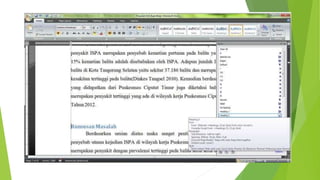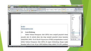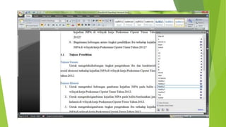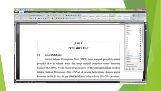 Dokumen tersebut memberikan instruksi langkah-langkah untuk membuat daftar isi, nomor halaman, header dan footer, halaman judul, daftar gambar, memberi judul pada gambar, membuat daftar gambar, membuat sitasi dan daftar pustaka secara otomatis di Microsoft Word. Langkah-langkah tersebut meliputi menggunakan style heading, section break, manage source, insert citation, dan bibliography.