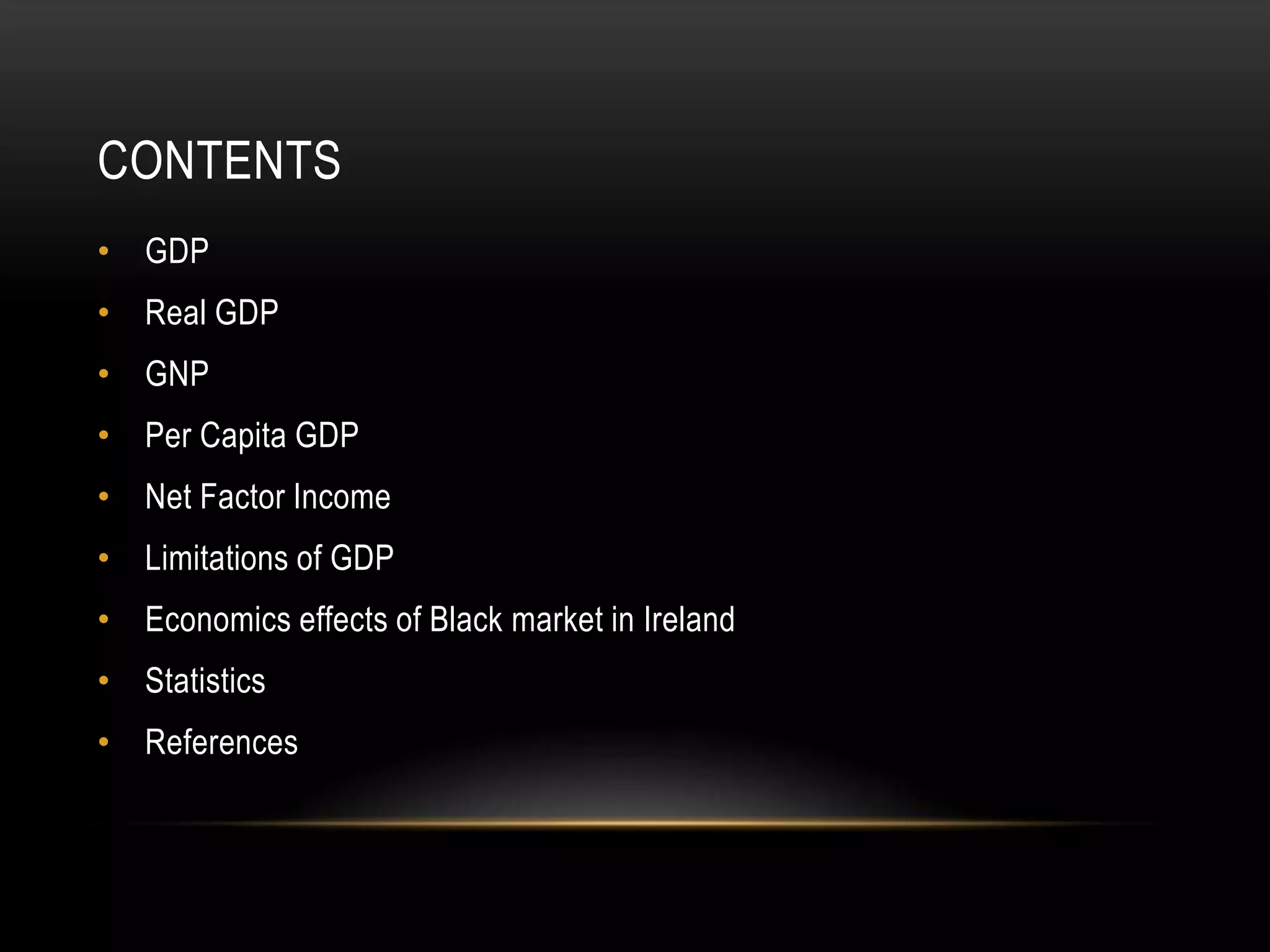 This document defines and explains key macroeconomic concepts including GDP, GNP, per capita GDP, and net factor income. It also discusses limitations of GDP as a measure and factors that can cause errors and omissions in GDP calculations such as the black market economy. Additional topics covered include income distribution across populations, the relationship between population size and economic growth, and how external factors can positively or negatively impact an economy.