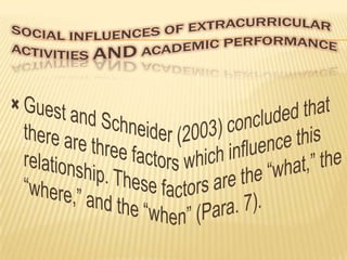 This study examined the relationship between participation in extracurricular activities and academic performance among students enrolled in business programs at Hazara University. The study found that participation in athletics, community service, and watching television were associated with improved academic performance, while participation in musical activities was not. The survey results indicated that different extracurricular activities can have varying effects on students' grades and learning.