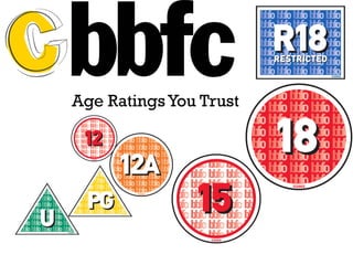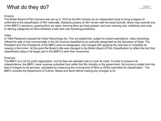 The BBFC is an independent non-profit organization established in 1912 that classifies films, videos, and DVDs shown and released in the UK. It uses a ratings system (U, PG, 12A, 15, 18) to provide guidance to consumers about what age films are suitable for based on content like violence, language, sex, and drug use. The BBFC is funded through fees paid by film distributors and aims to classify works consistently while maintaining its independence from industry and government influence.