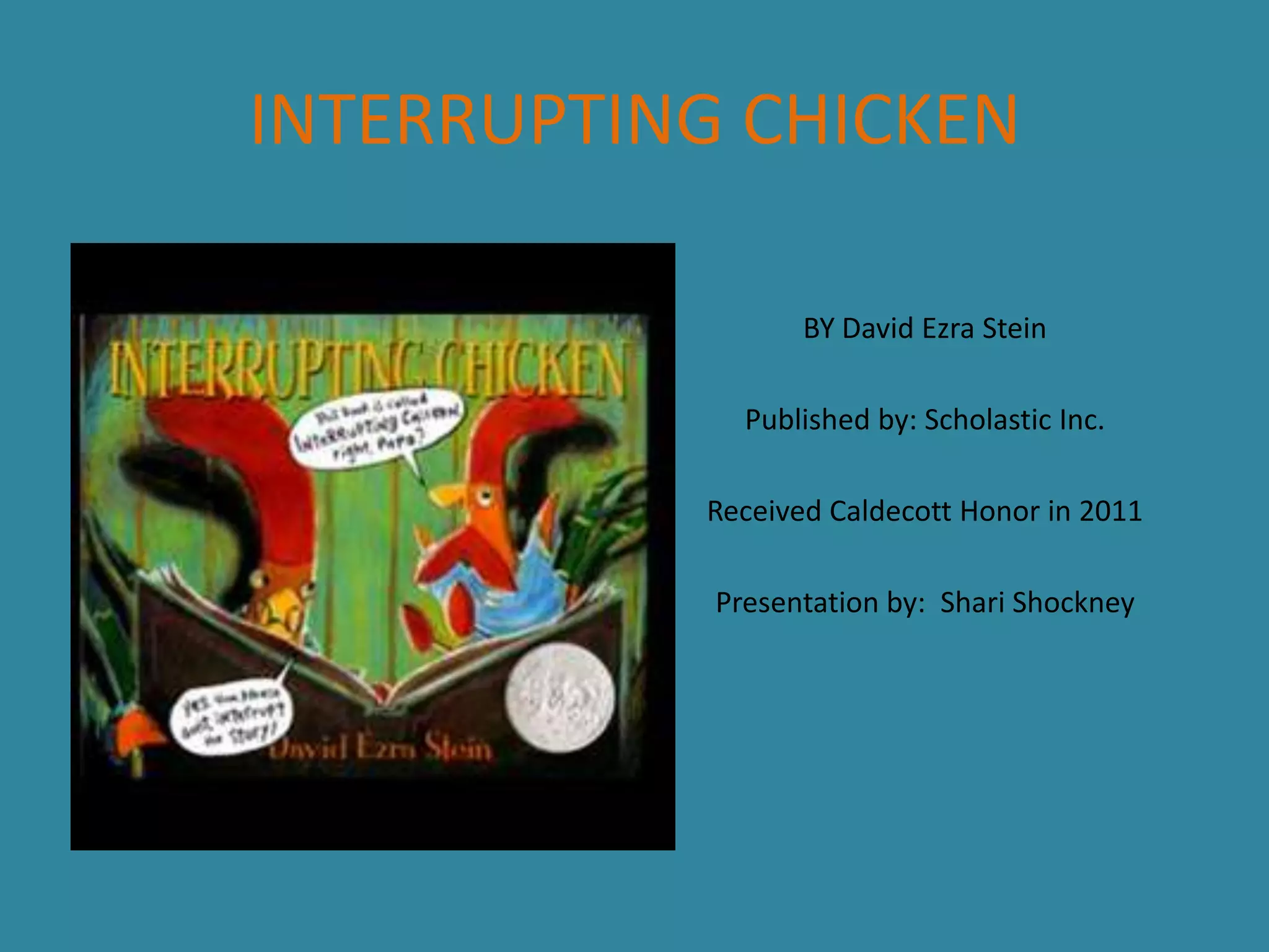 The document summarizes the style, media, techniques, and composition used in the illustrations of the book "Interrupting Chicken" by David Ezra Stein. It notes that Stein uses a comic/cartoon style with exaggerated features. He employs various media like watercolor, crayon, and ink. Line, shape, color, and texture are used expressively. Composition techniques like asymmetrical and symmetrical balance are utilized to evenly distribute elements on the page.