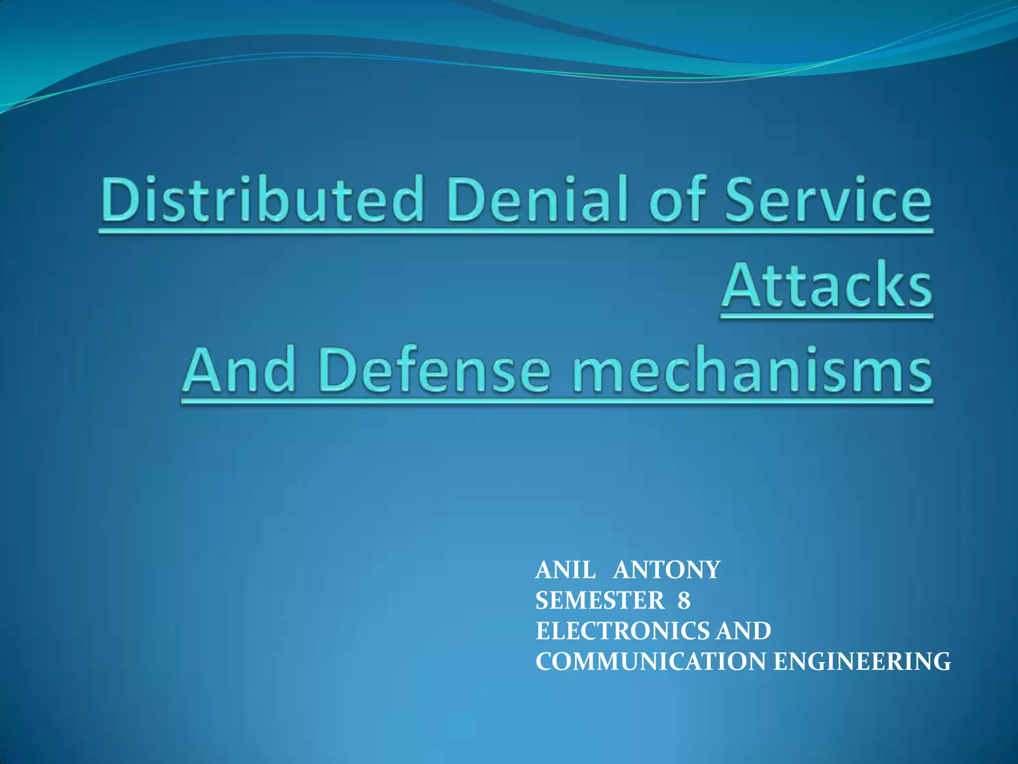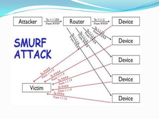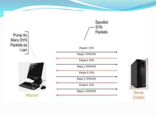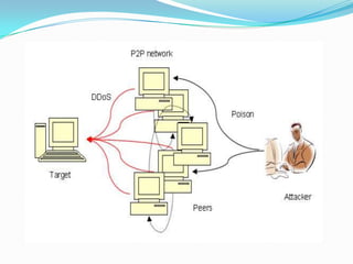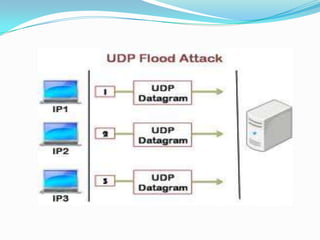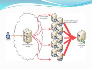DDoS attacks target companies and institutions that provide online services. They work by overloading servers with traffic from multiple compromised systems known as "bots" or "zombies". Common DDoS attack types include SMURF, TCP SYN/ACK, UDP flood, DNS amplification, and attacks using peer-to-peer networks. Defenses include configuring routers and firewalls to filter unauthorized traffic, limiting response messages, and tracking malicious activity on peer-to-peer networks. As attack methods evolve, continued development of detection and mitigation techniques is needed.