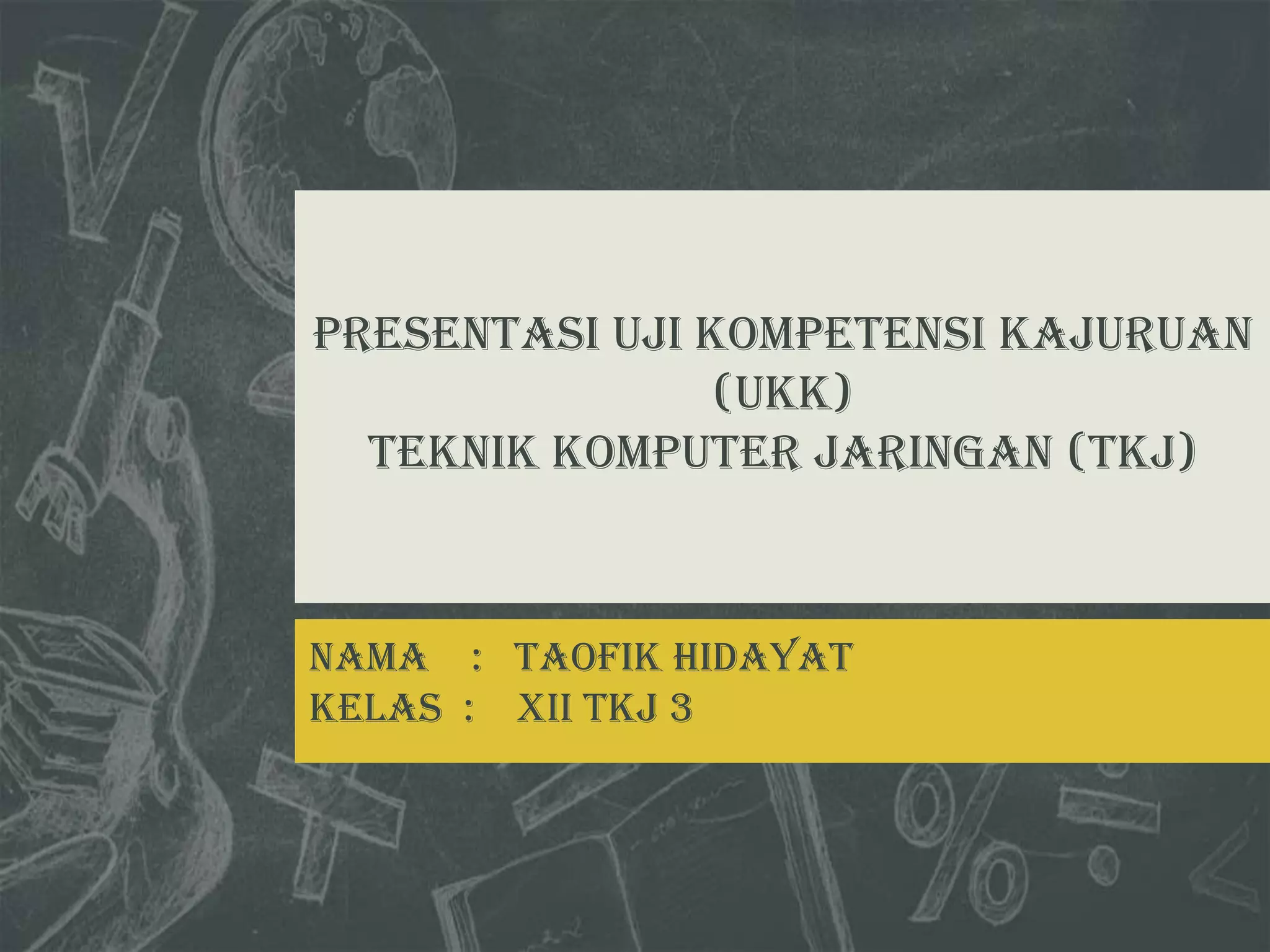Presentasi menjelaskan tentang uji kompetensi kajuruan (UKK) untuk teknik komputer jaringan yang meliputi instalasi client Ubuntu, instalasi server ClearOS, konfigurasi router sebagai gateway, instalasi dan konfigurasi perangkat sesuai topologi star, serta pengujian fungsi jaringan termasuk internet melalui proxy server.