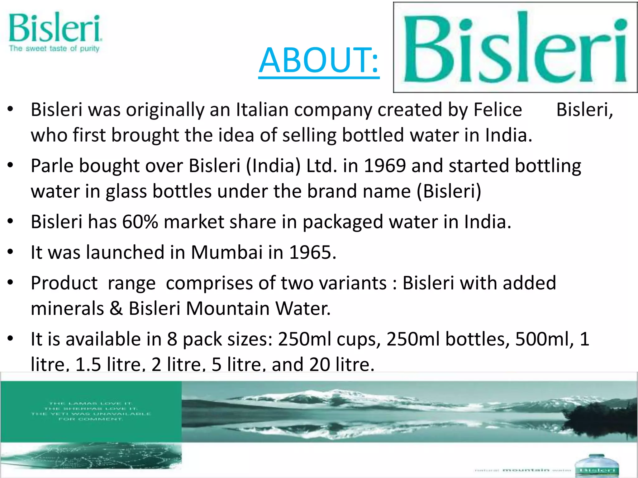 Bisleri is an Italian-founded Indian mineral water company with 60% of the packaged water market in India. It sources its mountain water from natural springs located in the Himalayan and Shivalik mountain ranges. In addition to its core mineral water, Bisleri offers mountain water and recently launched a fizzy soda water. While Kinley, Aquafina, and local brands comprise the remaining 40% of the market, Bisleri has established itself as the leading water brand through innovative products and a focus on advertising and hygiene.