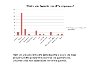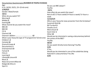 This document summarizes the responses to a documentary questionnaire given to 30 people. It shows that comedies are the most popular TV genre while documentaries are less so. Most people watch TV in the evenings and BBC1 is one of the most watched channels, indicating an audience for a BBC documentary. Two-thirds of respondents expressed interest in a documentary about the BBC. Susannah Reid and Bill Turnbull emerged as the most popular news presenters.