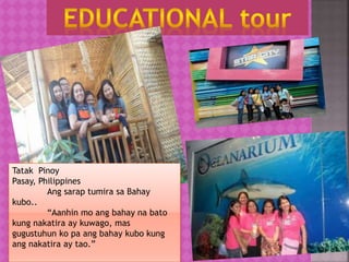 Tinutukoy ng dokumento ang kagandahan ng pamumuhay sa bahay kubo kumpara sa bahay na bato. Ipinapahayag nito ang halaga ng tao sa pook na tinitirhan, na nalalampasan ang materyal na aspeto ng tahanan. Naglalaman ito ng mga sanggunian sa mga kaganapan tulad ng brigada eskuwela at iba pang aktibidad.