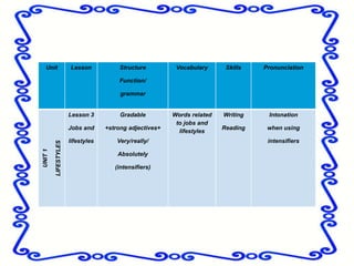 The document outlines the structure and content of a lesson about jobs, lifestyles, and quality of life. It includes an introduction comparing the lives and jobs of two people, Joe and Miranda. Joe has a high-paying job but works long hours and feels stressed, while Miranda has a lower-paying job she finds interesting and has more free time. The lesson teaches intensifiers like "very", "really", and "absolutely" to modify gradable adjectives like tired, big, and happy. Students practice intensifiers and adjectives in sentences to describe Joe and Miranda's different standards of living.