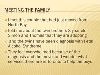 The document discusses a couple who has adopted twin boys diagnosed with Fetal Alcohol Spectrum Disorder. The couple, who recently moved to Toronto from North Bay, feels overwhelmed by the diagnosis and wants to learn about services available to help the boys. The twins show signs of cognitive delay and impulse control issues. The document provides information on Fetal Alcohol Spectrum Disorder, including common characteristics like growth patterns, facial features, and central nervous system problems. It also lists several agencies in Toronto that provide support and services for those affected by FASD.