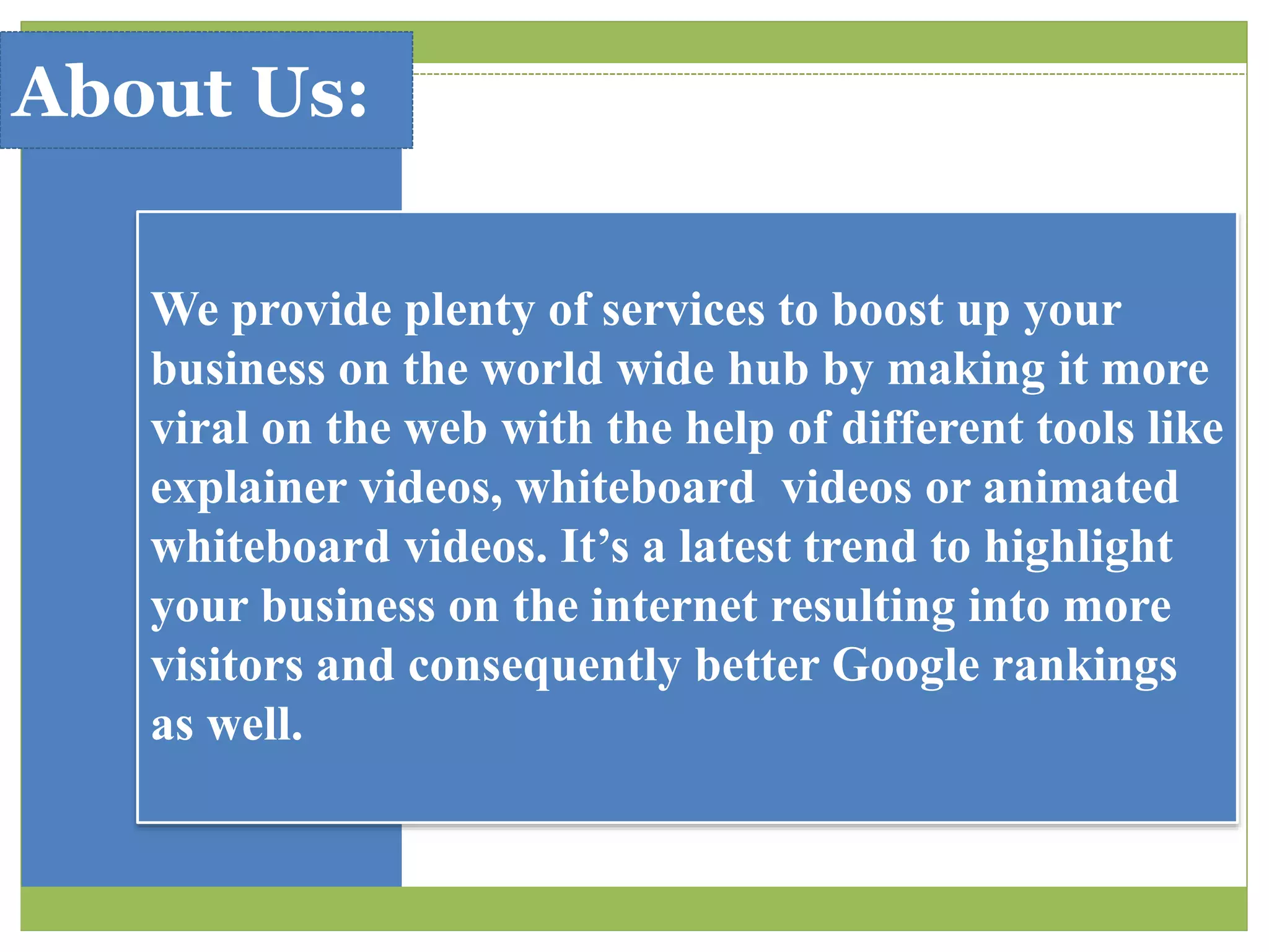 The document outlines services offered by a business, including explainer videos, website design, social media management, SEO, virtual assistance, and consulting to enhance online visibility and customer engagement. It emphasizes the importance of modern tools like whiteboard videos and social media for improving website traffic and Google rankings. The company provides its contact information for further inquiries.