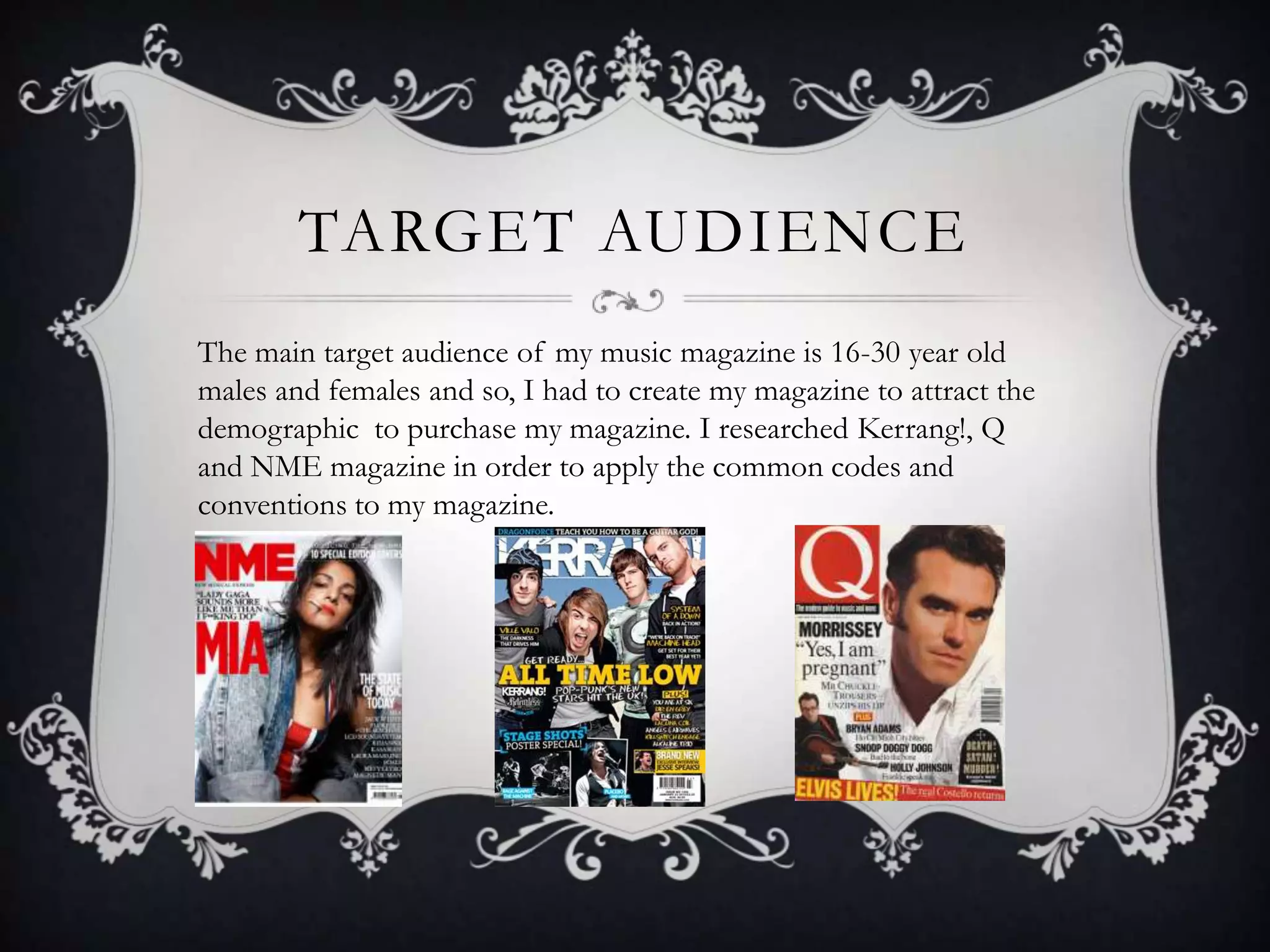 The document discusses how the author addressed their target audience of 16-30 year old males and females in their music magazine. They included young 17 year old models on the cover that were similar in age to the target demographic. While the main cover model was female, she was dressed in a masculine way to not alienate male readers. The color scheme and photography were also chosen to be unisex and not too feminine. The magazine featured a diverse range of music genres but emphasized alternative bands to attract the target audience.
