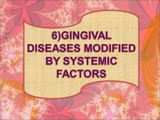 The document outlines various types of gingival diseases in children, including eruption gingivitis, dental plaque induced gingivitis, allergies, and acute gingival diseases. Acute gingival diseases discussed include herpes simplex virus infection, which causes painful sores in the mouth and gums and is treated with antiviral medication and pain relief. Recurrent aphthous ulcers and acute necrotizing gingivitis are also covered as acute conditions, as well as acute candidiasis and bacterial infections. Chronic nonspecific gingivitis and gingival diseases modified by systemic factors are also classified.
