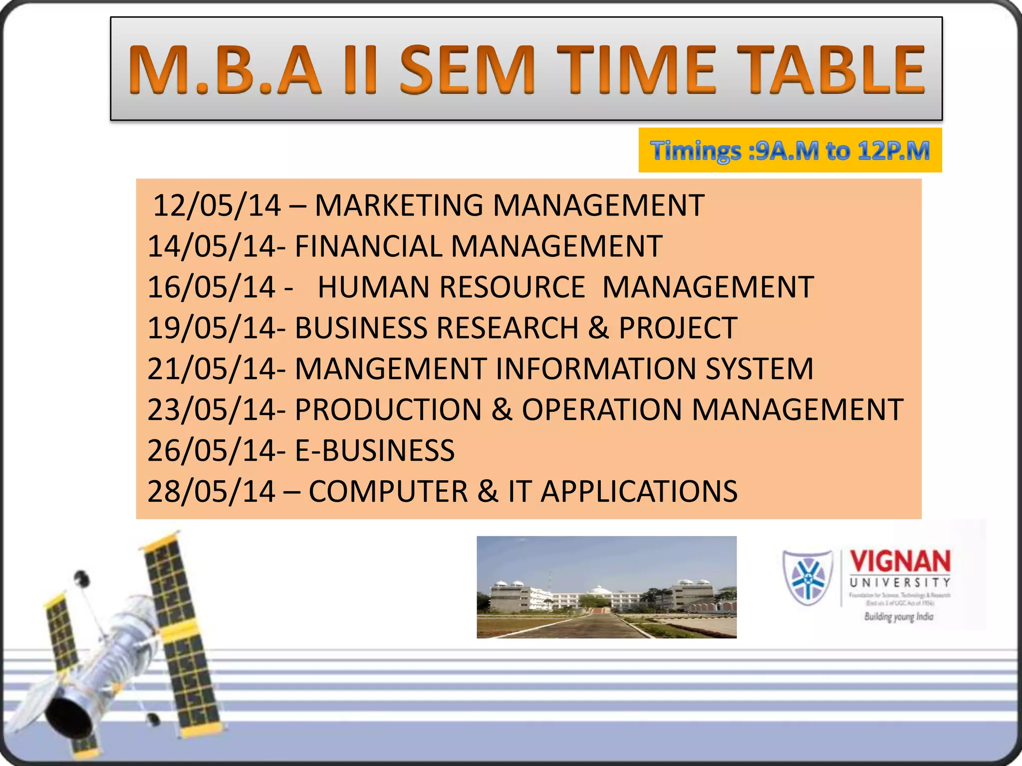 This document lists the dates and topics for 8 business management seminars or courses scheduled between December 5th, 2014 and May 28th, 2014. The topics include Marketing Management, Financial Management, Human Resource Management, Business Research & Project, Management Information System, Production & Operation Management, E-Business, and Computer & IT Applications.