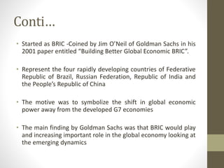 BRICS, initially comprising Brazil, Russia, India, and China, was formed to represent emerging economies and shift global economic power from the G7. The group aims to enhance trade, education, technology, and economic growth among its members while addressing challenges such as competition and differing political systems. Future prospects include the potential to rival the G7 in GDP by 2050 and the establishment of a development bank to provide loans in local currencies.