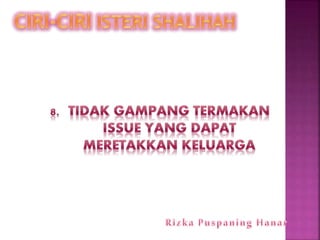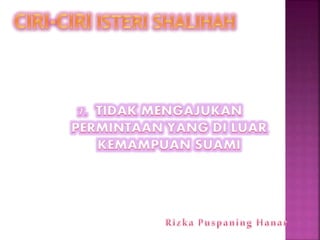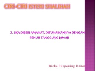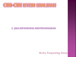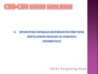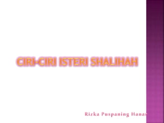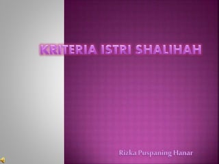 Dokumen tersebut membahas tentang istri yang tidak boleh keluar tanpa izin suami berdasarkan hadis Nabi Muhammad SAW. Dokumen juga membahas tentang hadis lain yang menyatakan bahwa istri akan masuk surga jika melaksanakan shalat lima waktu, berpuasa di bulan Ramadhan, menjaga diri, dan taat kepada suaminya.
