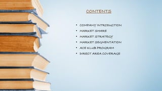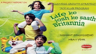 The document presents a project report on Britannia's 'Ace Klub Program', detailing the company's market share, strategies, and operational structure in the Indian biscuit industry. It highlights key market players, segmentation, and sales management while outlining objectives and challenges faced in merchandising and distribution. The report emphasizes the need for improved retailer engagement and stronger brand visibility to bolster business growth.