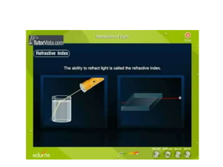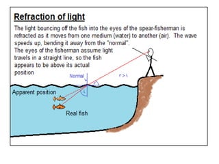 Light refracts when passing from one medium to another with a different density. When light travels from a less dense to a more dense medium, it bends toward the normal, and when traveling from more dense to less dense, it bends away from the normal. The refractive index is a ratio of the speed of light in a vacuum to the speed in a particular medium, and is represented by the Greek letter μ. Snell's law describes the relationship between the angles of incidence and refraction.