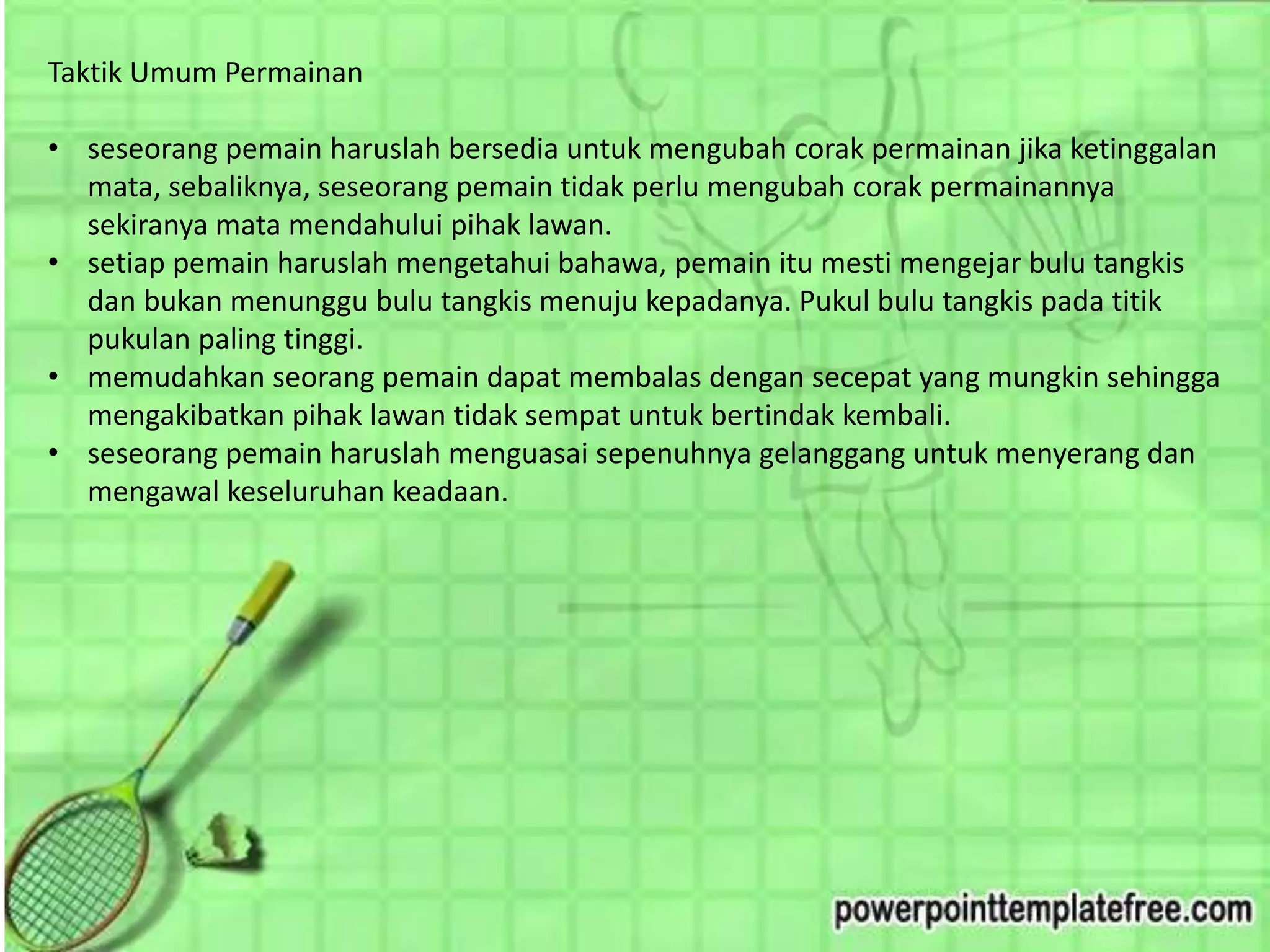 Dokumen ini membahas taktik permainan bulu tangkis, menekankan pentingnya kecepatan, posisi, dan inisiatif untuk menyerang serta mengendalikan permainan. Pemain harus selalu bergerak ke arah bulu tangkis dan menggunakan pukulan tinggi untuk efektivitas maksimal, terutama dalam permainan beregu yang memerlukan kerjasama dan komunikasi antara pasangan. Selain itu, terdapat aturan mengenai tinggi tiang dan penanda pada gelanggang.