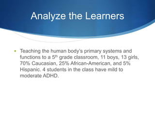 This document outlines a lesson plan to teach 5th grade students about the major systems and functions of the human body over the course of a week. The class has 24 students from diverse racial backgrounds. Over 5 days, students will learn about the skeletal, cardiovascular, nervous, digestive, and respiratory systems through singing songs, making movies, posters, games, and drawings. Technology like YouTube, Movie Maker, iPads, PowerPoint, and podcasts will be used to engage the students. The objective is for students to comprehend the functions of the body's systems with 90% accuracy by the end of the week.