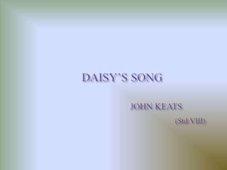 The document discusses a poem about a daisy flower. The daisy sings a simple song expressing its joy and pride in being part of nature. It sits upon a throne of grass like a king, able to watch all the pretty flowers passing by. The document asks questions about the subject of the poem and what flower leads a kingly life. It also prompts the reader to describe nature in 5 sentences or less and to write a poem about a rose flower.