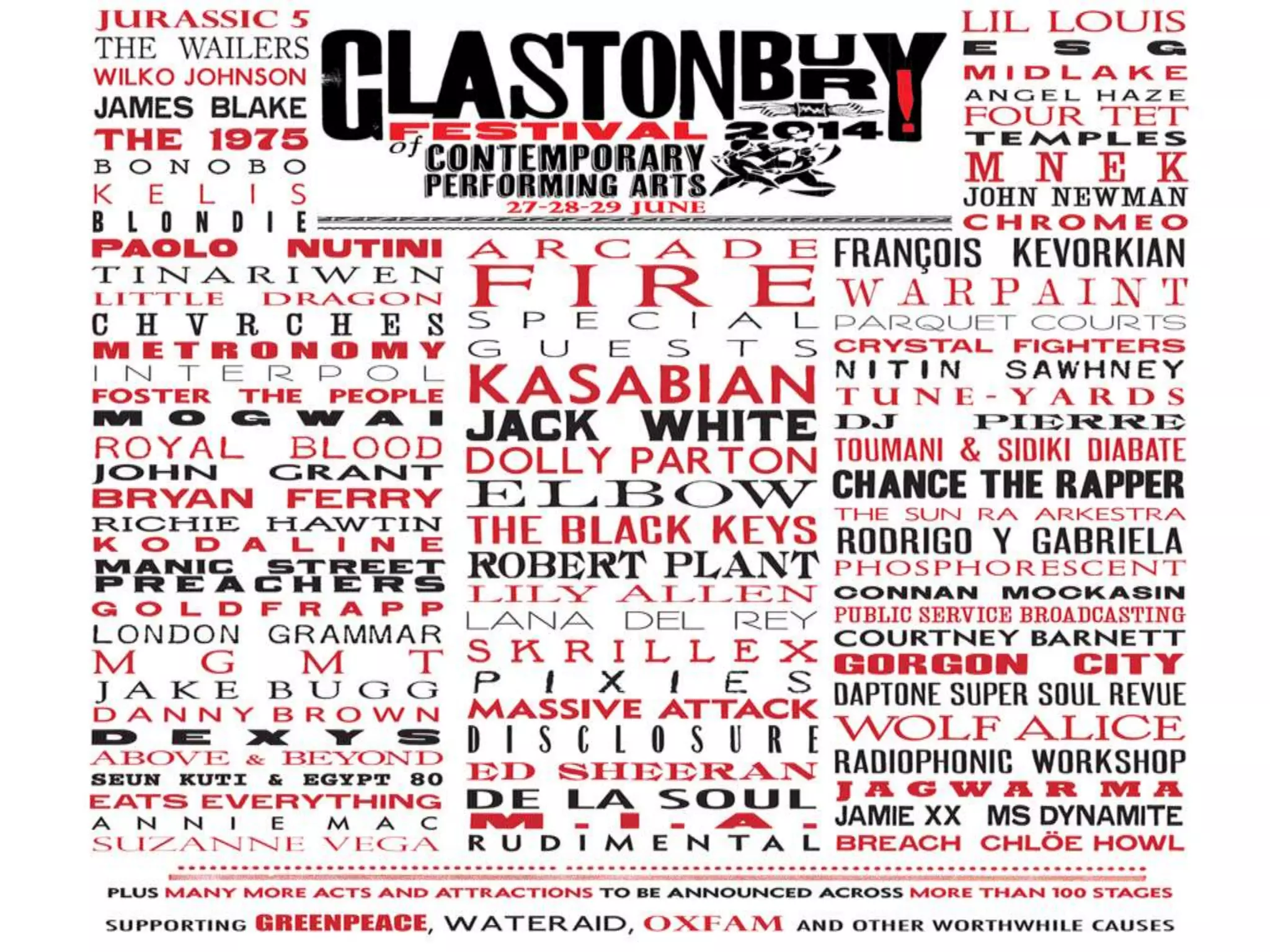 Glastonbury Festival is a 5-day music and arts festival held in Glastonbury, England between June 25-29, 2014. The festival began in 1970 and now attracts around 110,000 people each year to see performances by artists like Kasbian, Skrillex, and Rudimental. A 2006 documentary film by Julien Temple captures the evolution and energy of the festival over the decades through footage and performances.