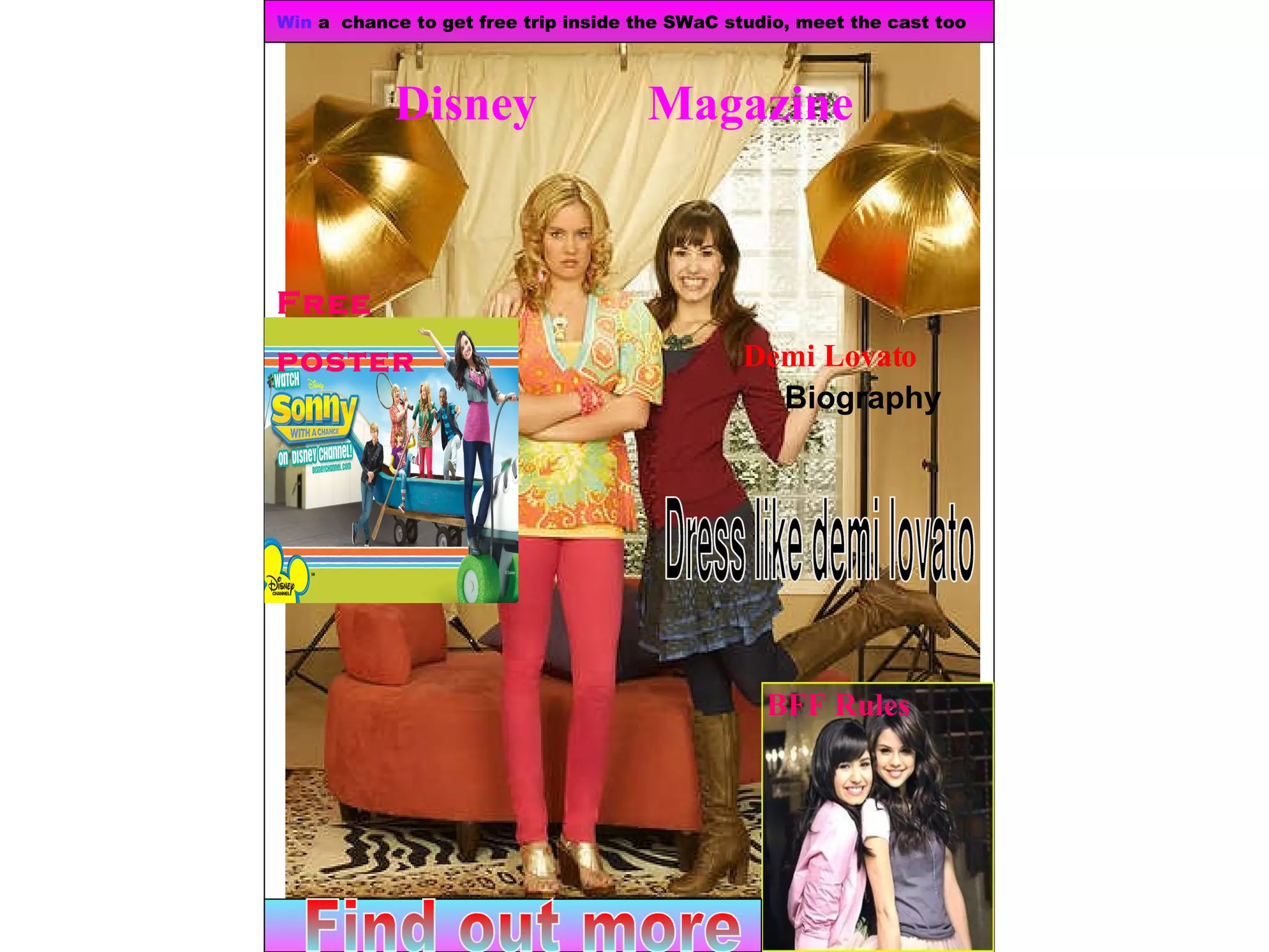- The document promotes Disney magazine and provides information about Demi Lovato. It lists facts about Lovato such as her full name, age, parents, siblings, heritage, favorite foods and activities.